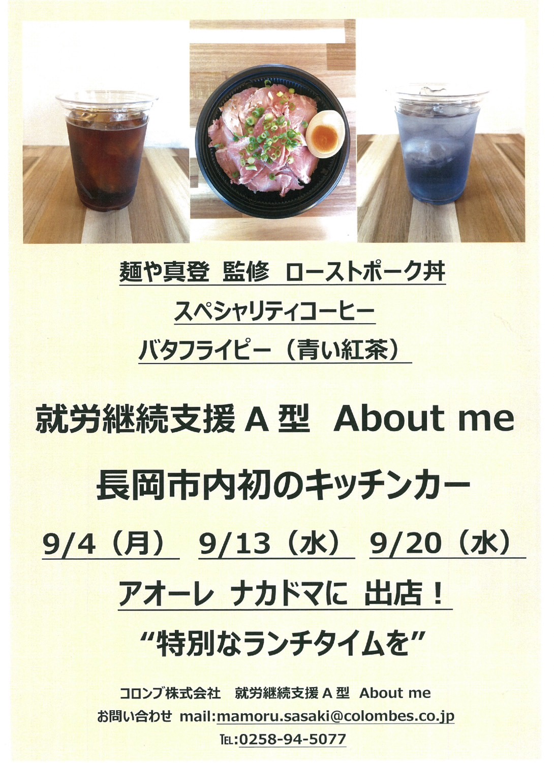 キッチンカー出店のお知らせ2023.09.03催事情報9月4日(月) 9月13日(水) 9月20日(水) アオーレ長岡「アオーレ ナカドマ」 弊社のキッチンカーAbout meはこちらで出店します!出店予定時間 11:00〜13:00 数量限定! 無くなり次第終了とさせていただきますので、お早めにご利用ください。MENU ・麺や真登 監修 ローストポーク丼 ・スペシャリティコーヒー ・バタフライピー(青い紅茶)開場 アオーレ長岡 〒940-0062 新潟県長岡市大手通1丁目4番地10 弊社HPオープン前の記事 キッチンカー出店のお知らせ次の記事