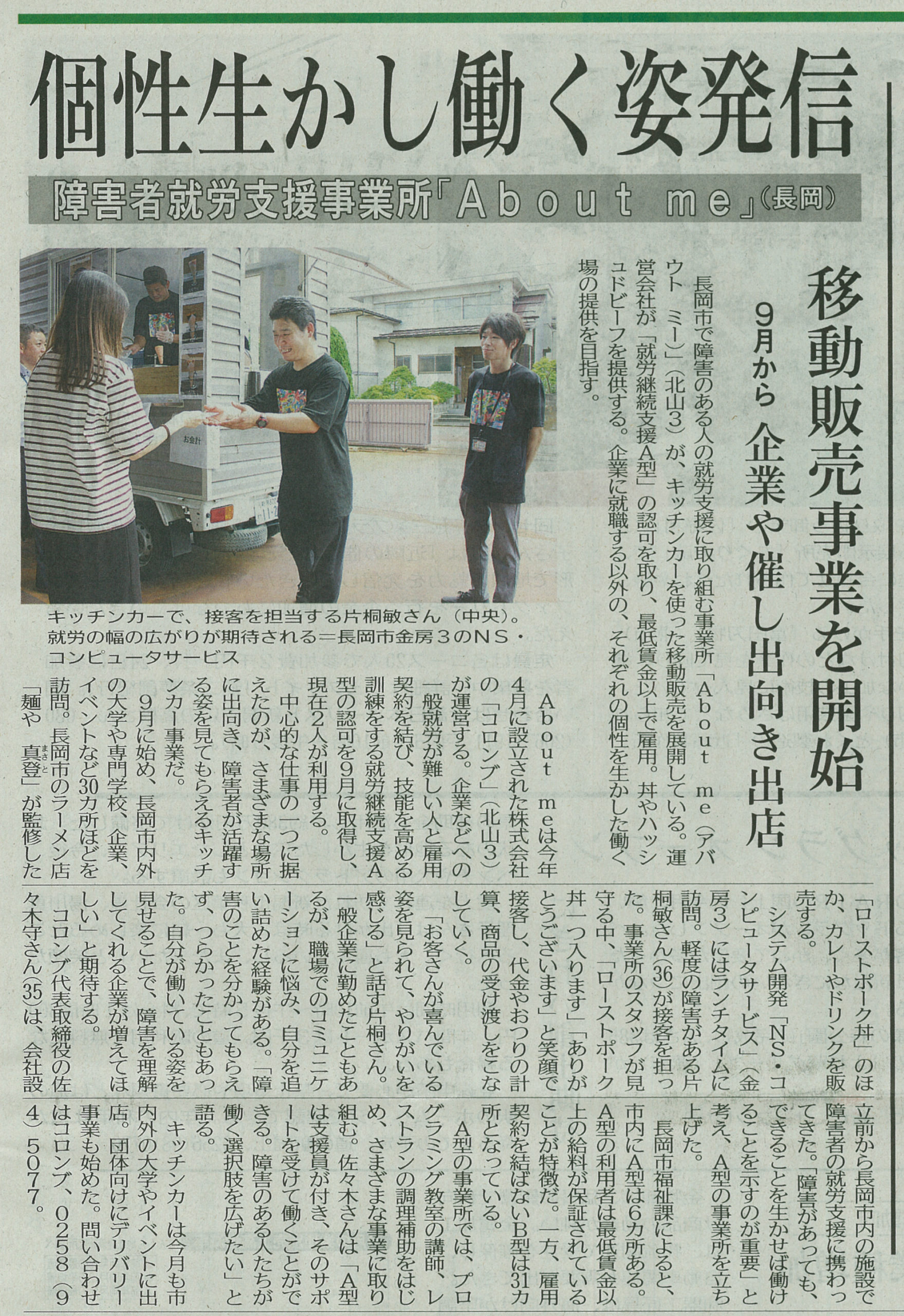 新潟県長岡市で障害のある人の就労支援に取り組む事業所「About me(アバウト ミー)」が、キッチンカーを使った移動販売を展開している。運営会社が「就労継続支援A型」の認可を取り、最低賃金以上で雇用。丼やハッシュドビーフを提供する。企業に就職する以外の、それぞれの個性を生かした働く場の提供を目指す。