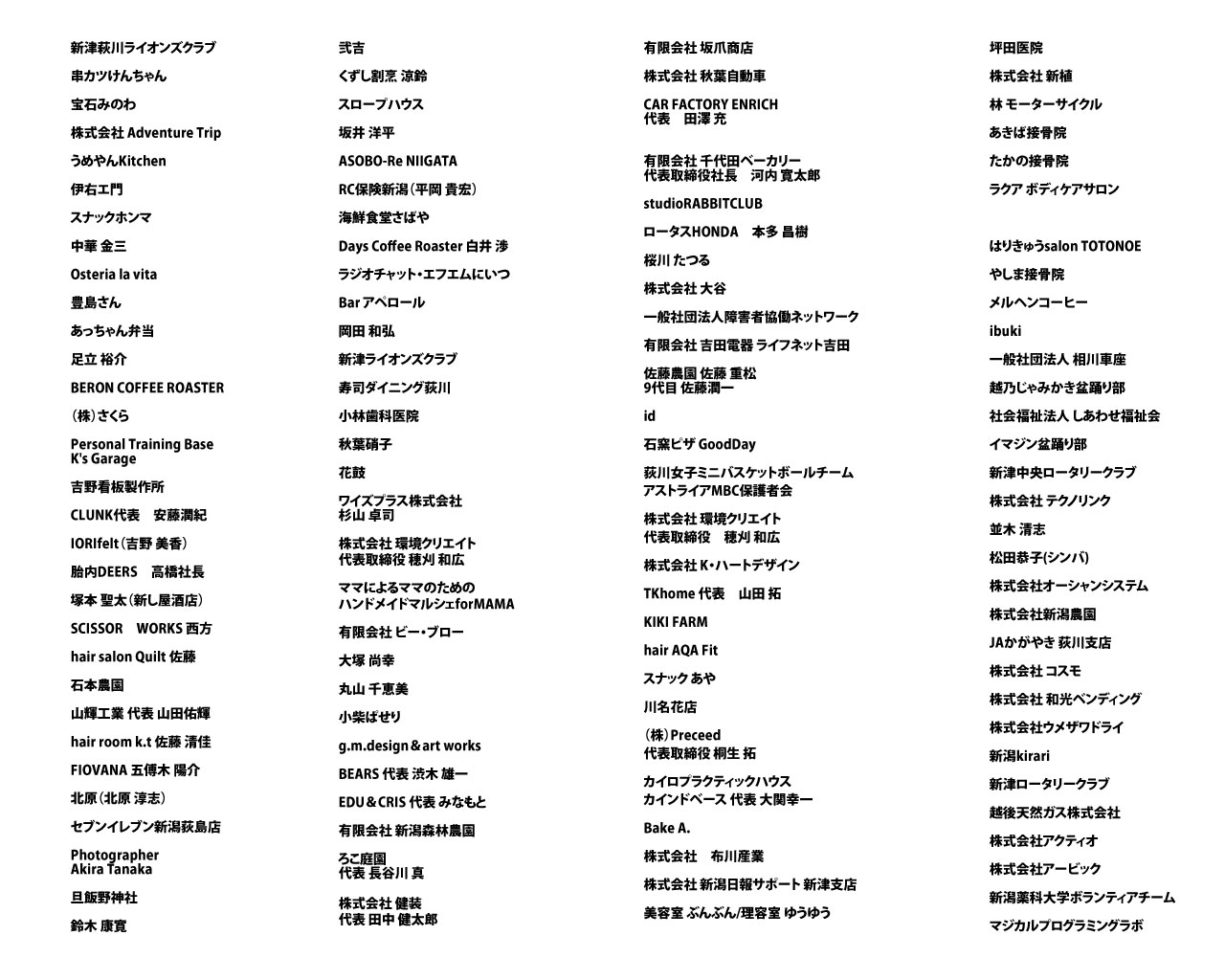 新潟市 / 新津商工会議所 / 新津ライオンズクラブ / 新津荻川ラインズクラブ / 荻川商工会 / 新津中央ロータリークラブ / 新津ロータリークラブ / 一般社団法人スリーピース